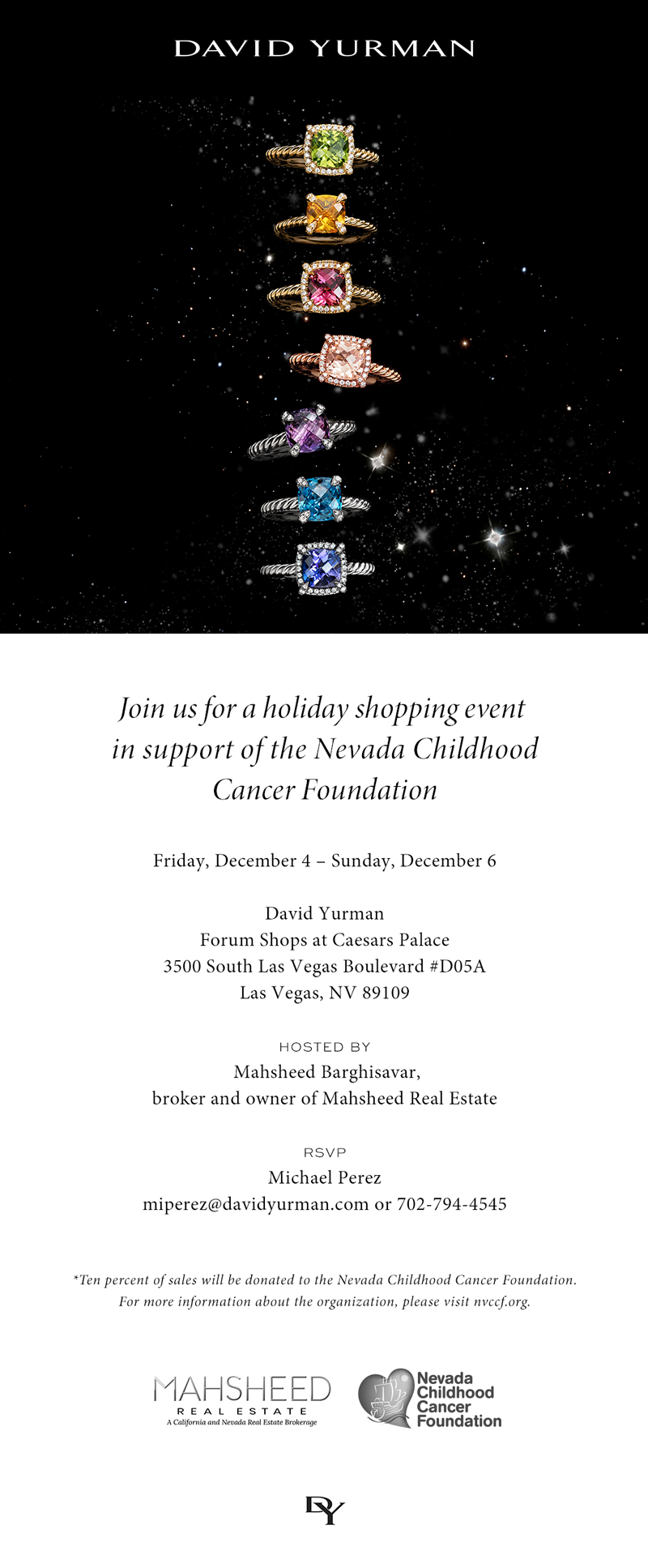 I’m soo ecstatic to partner with @davidyurman @davidyurmanmen for a special event December 4-6 where 10% of sales are donated to @nvccf ! For those of you who don’t know, Mahsheed Real Estate donates a portion of our commissions after every closing. I truly love Nevada Childhood Cancer Foundation. Everyone behind this foundation has nothing but pure intentions to help those in need. So many pure hearts and I am grateful to be able to play a small role with these beautiful people at a foundation where hearts and intentions are in the right place. Anyone who wants to buy jewelry coming up, please consider shopping at @davidyurman during December 4-6 so we can help families with their fight to beat cancer ! Please RSVP with @laltiste. Message me for details.??