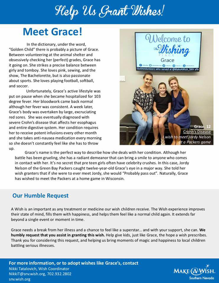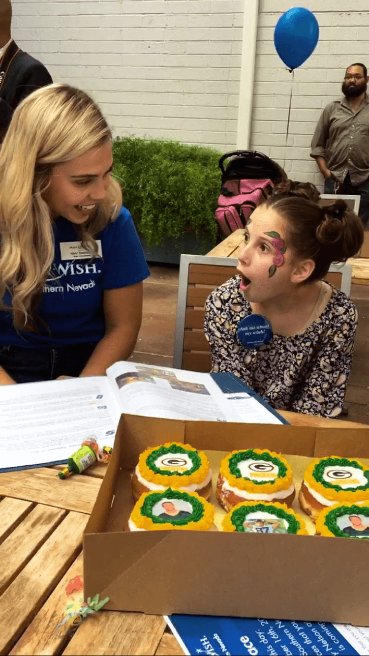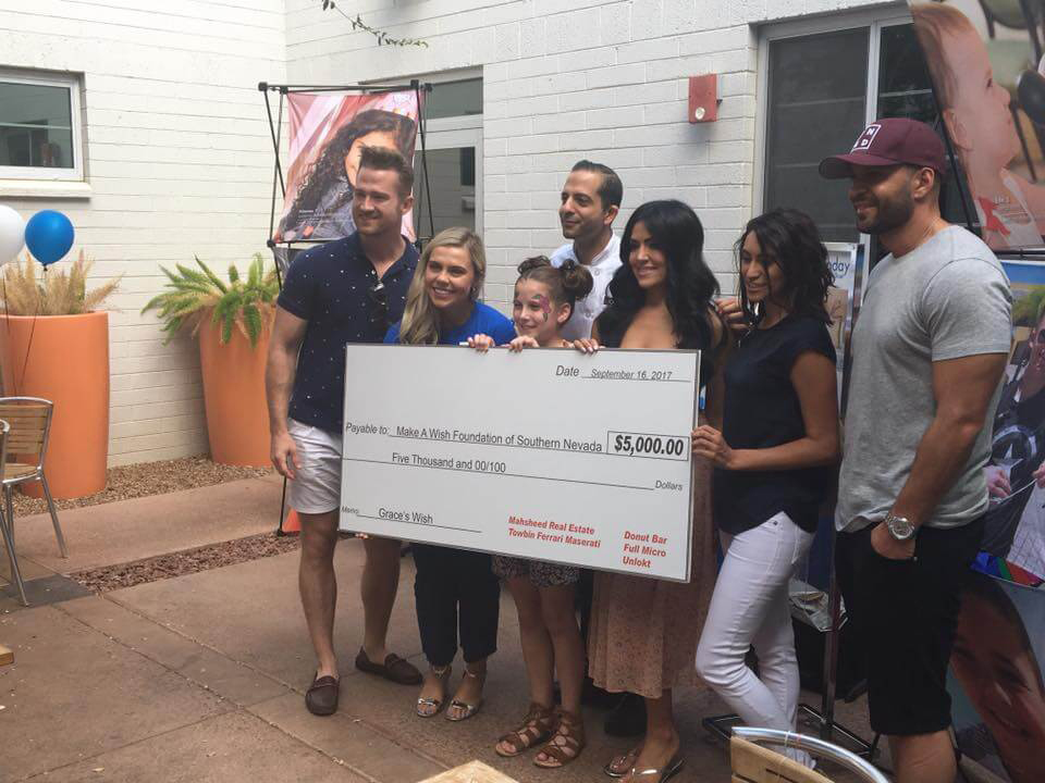 We had such an incredible turnout at our newest Make A Wish to fulfill Grace’s wish of meeting Jordy Nelson from the Green Bay Packers ! Myself along with Donut Bar, Full Micro , UNLOKT and Towbin Ferrari Maserati joined forces in order to create a memorable day for Grace where we not only raised $5,000 to make her wish come true, but also revealed to her for the first time that her wish is coming true! There was an outpouring of love and support that showed up to donate and we are forever grateful! There were so many people who took the time to donate gifts for the raffles, or donated money or showed up and it was so beautiful to experience so much love and kindness in our Las Vegas Community! From the bottom of my heart, THANK YOU all so much in helping me help Grace become a one happy child! Grace is 12 years old and has sever Crohns Disease. Even the steroids she takes to help control the pain makes her nauseous. Granting her wish gives her the chance to forget about her disease and enjoy life giving back to her.